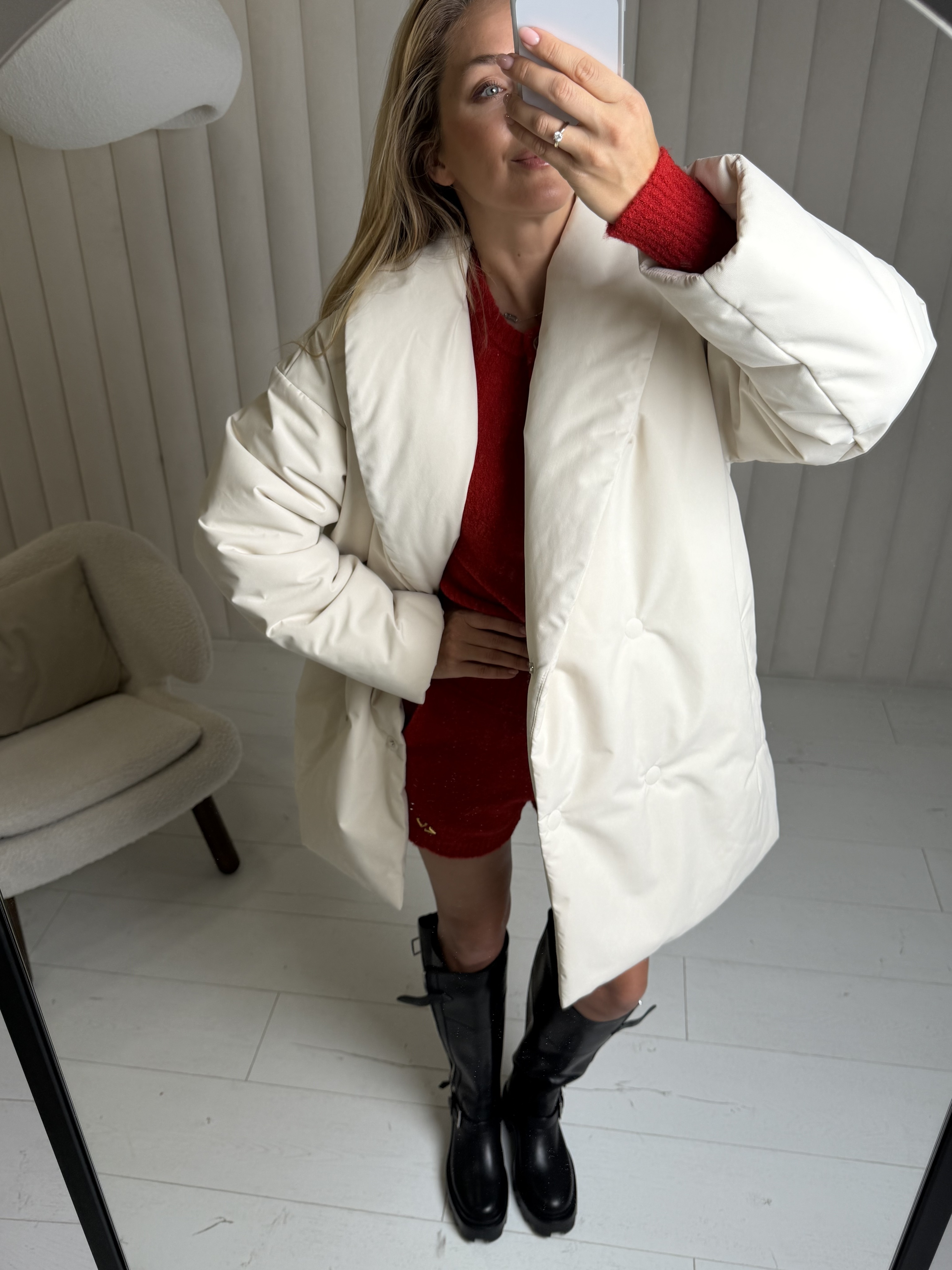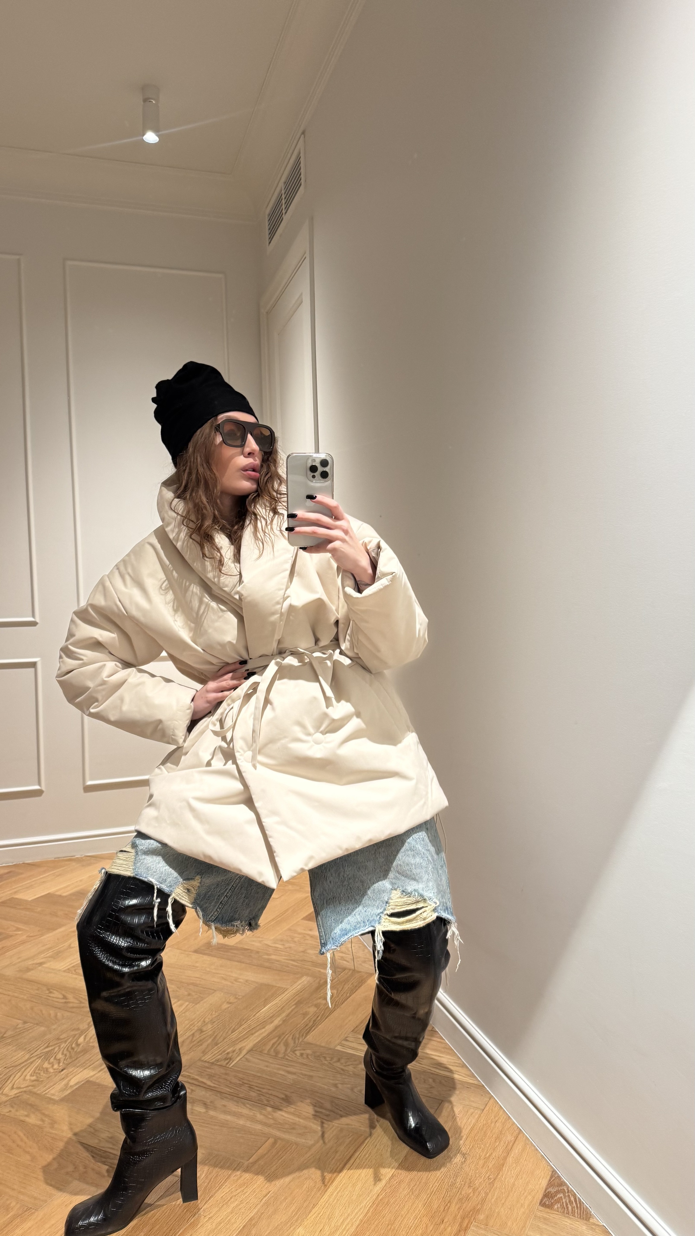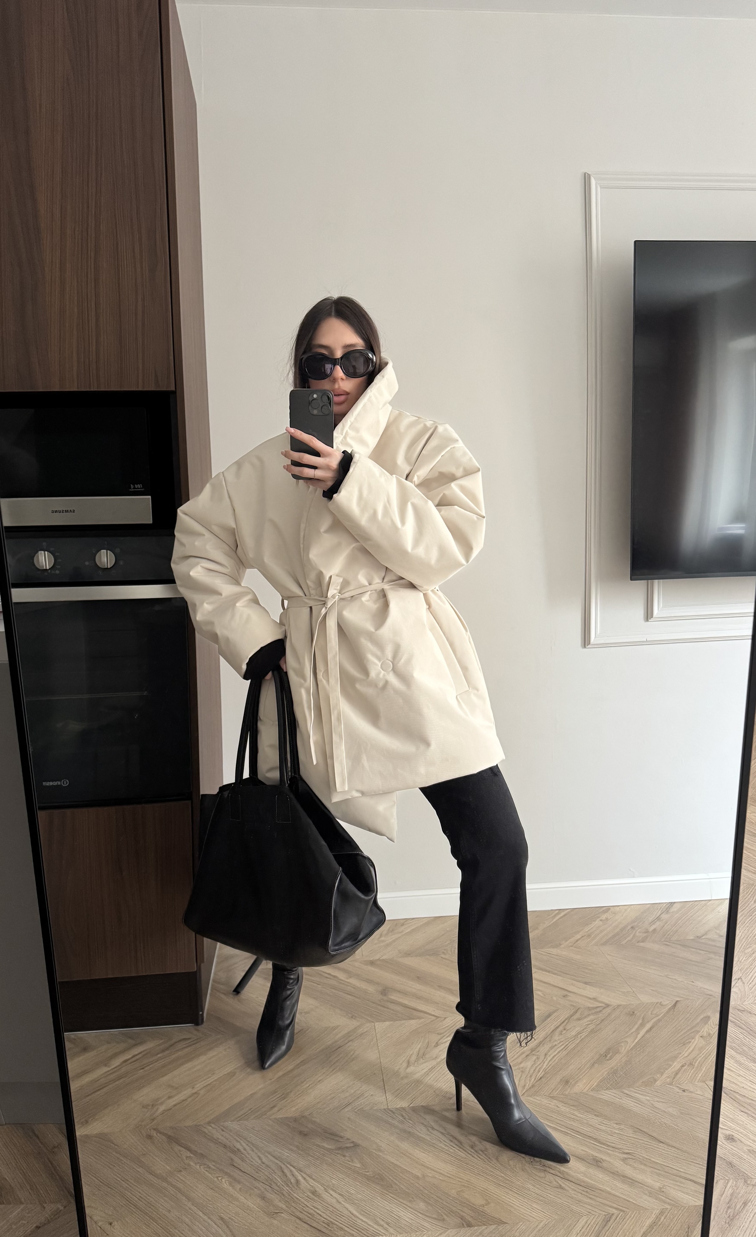 Облегченный вариант с отложным шалевым воротником, мягким рукавом реглан и поясом на талии. Укороченная модель на воздушном синтепоне.
