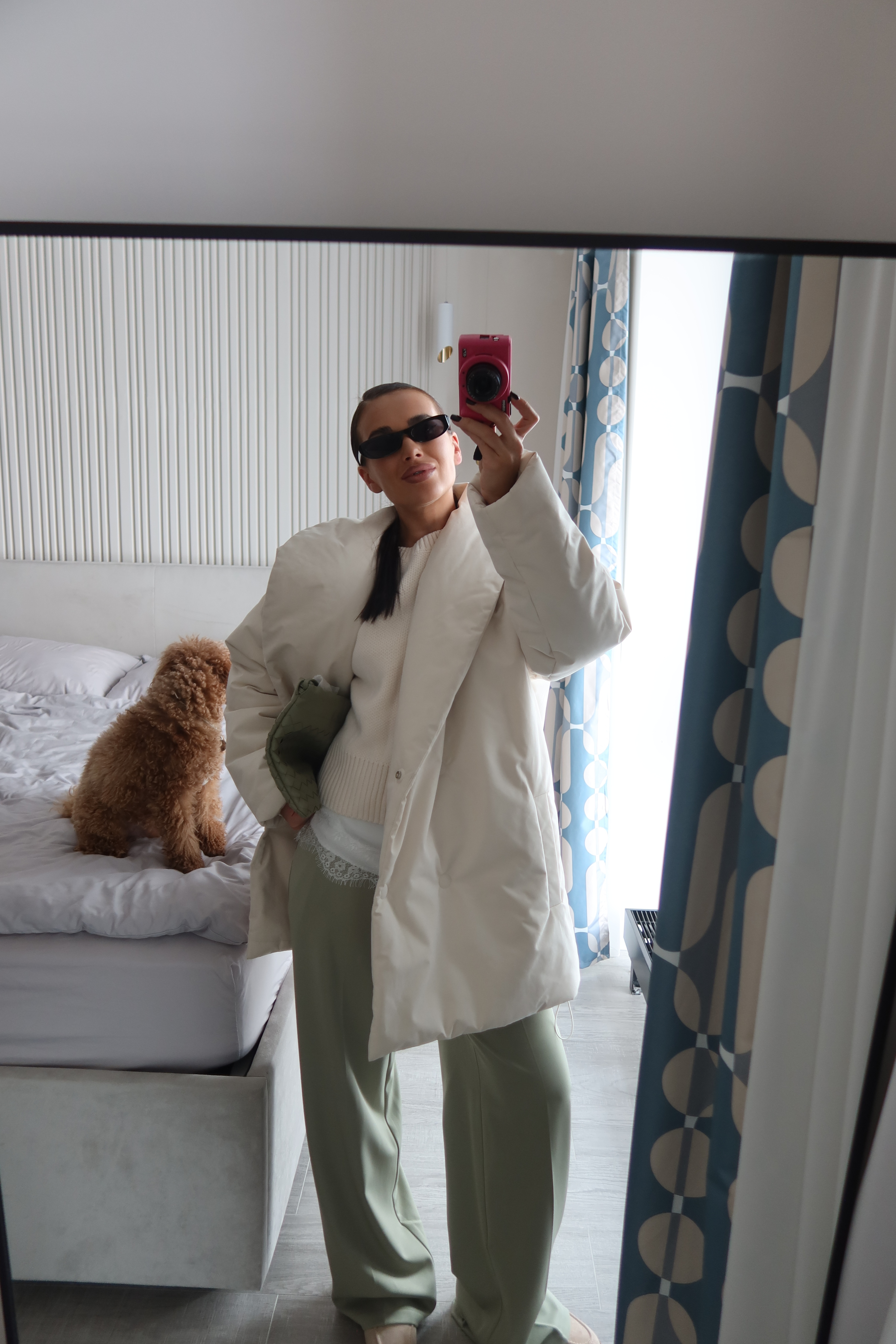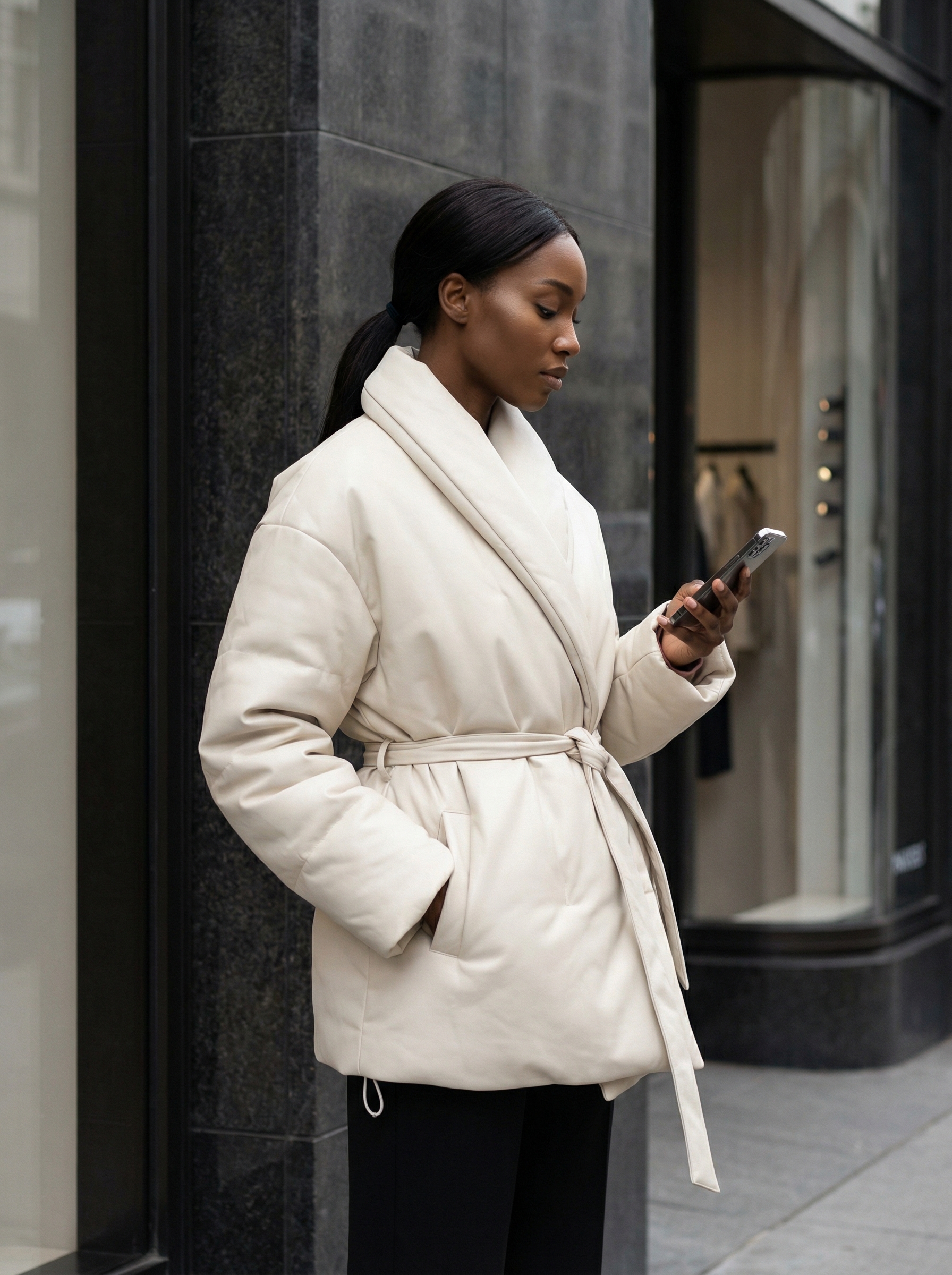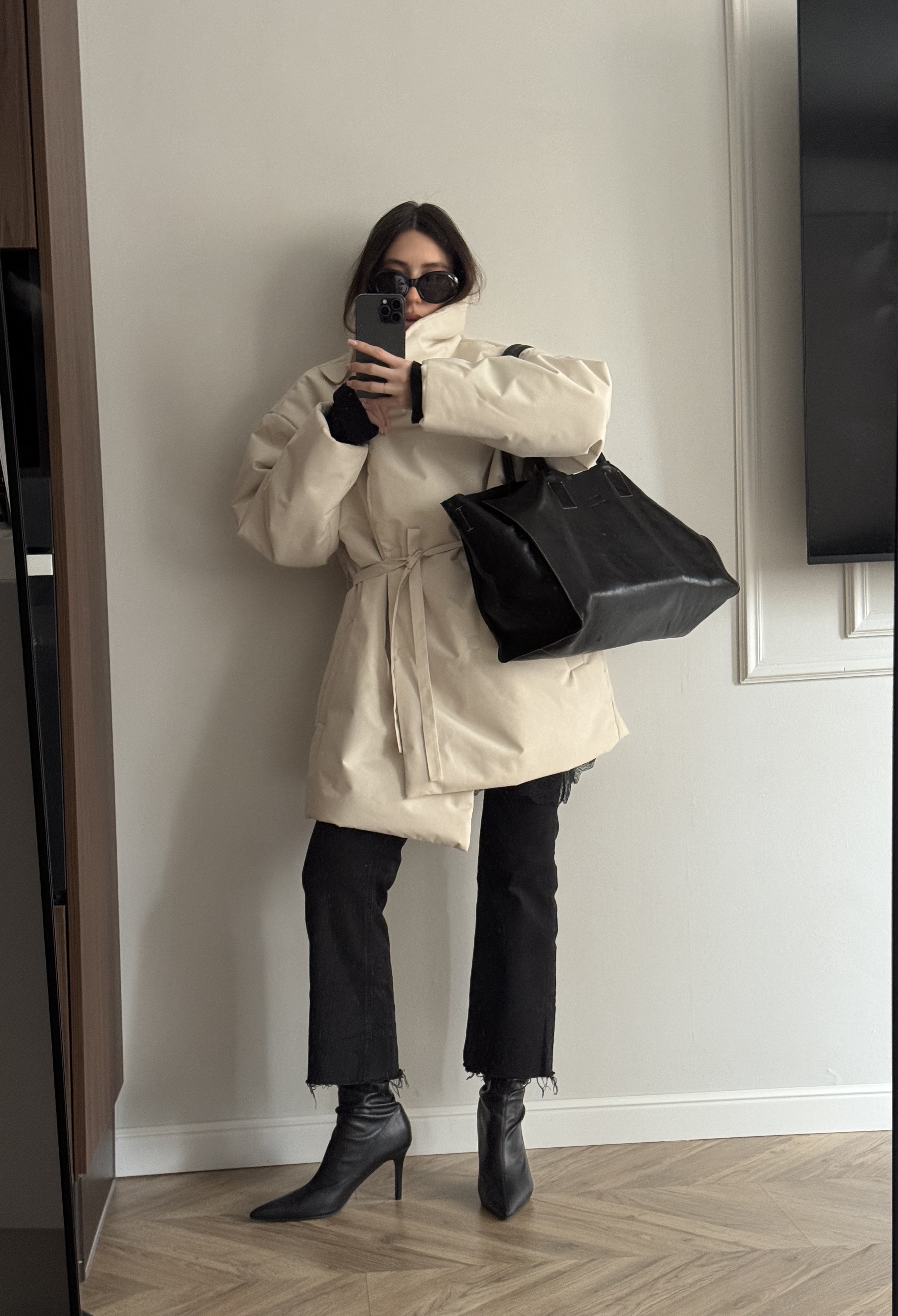Карманы в боковых швах и застежка на скрытые кнопки. Для дополнительной защиты от холода ширину изделия можно корректировать с помощью специальной регулировки, идущей по низу. Куртка выполнена из мягкой ткани с бархатистой, матовой поверхностью.