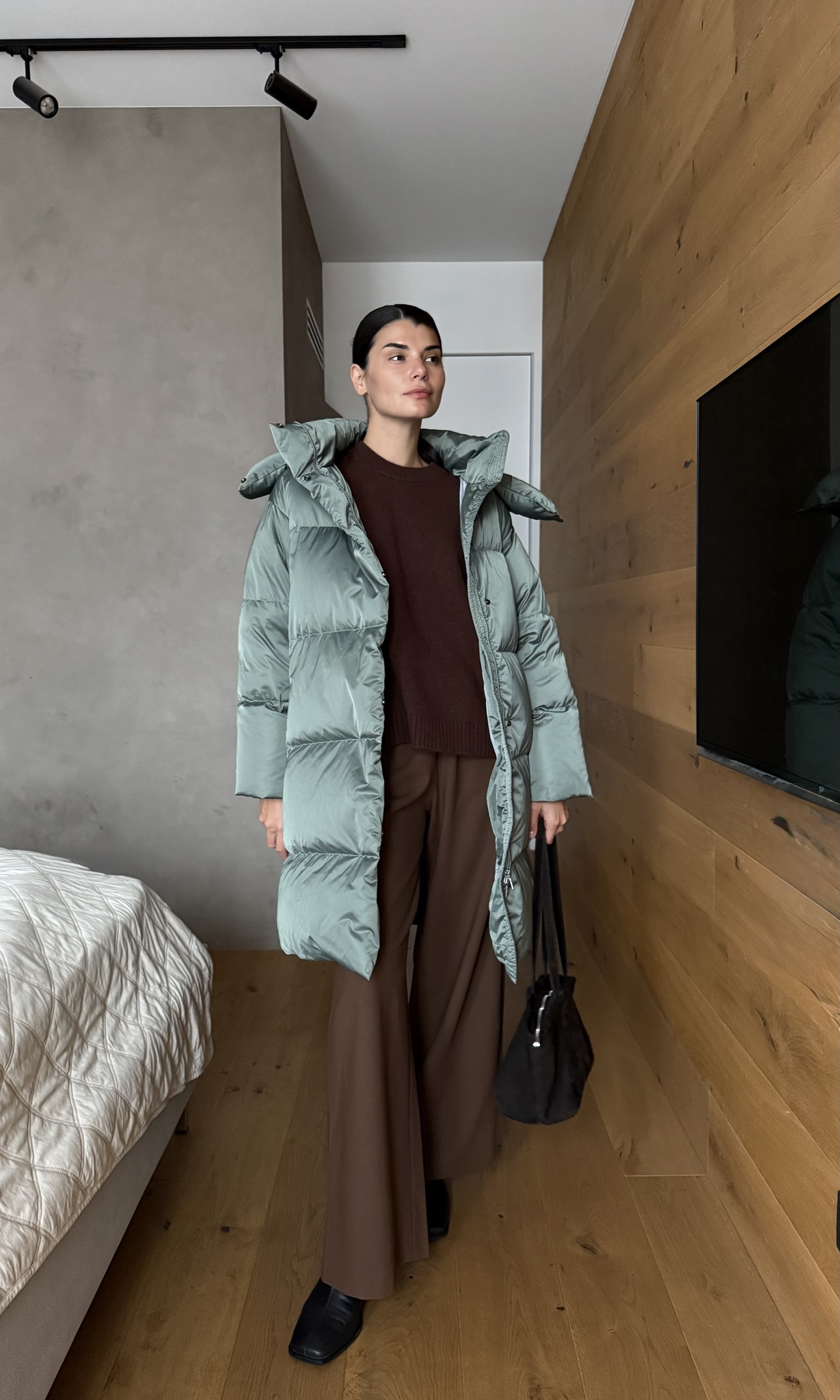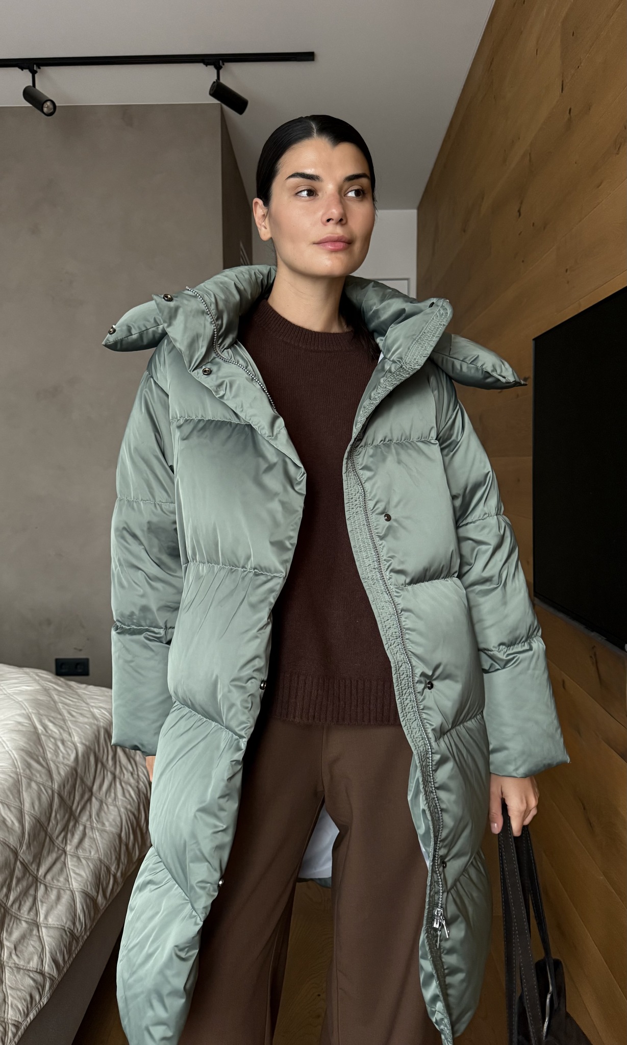 Пуховик средней длины отличное сочетание функциональности и уюта в любое время года, особенно при температуре до –30°C. Натуральный пух обеспечивает надежное тепло и комфорт, а практичные детали делают носку удобной: молния, которая открывается и снизу, позволит легко устроиться в машине или автобусе, не снимая куртку. Съёмный объемный капюшон защитит от ветра, а манжеты и регулируемая кулиска внизу подарят дополнительную защиту от холода и идеально подстроят силуэт по фигуре.